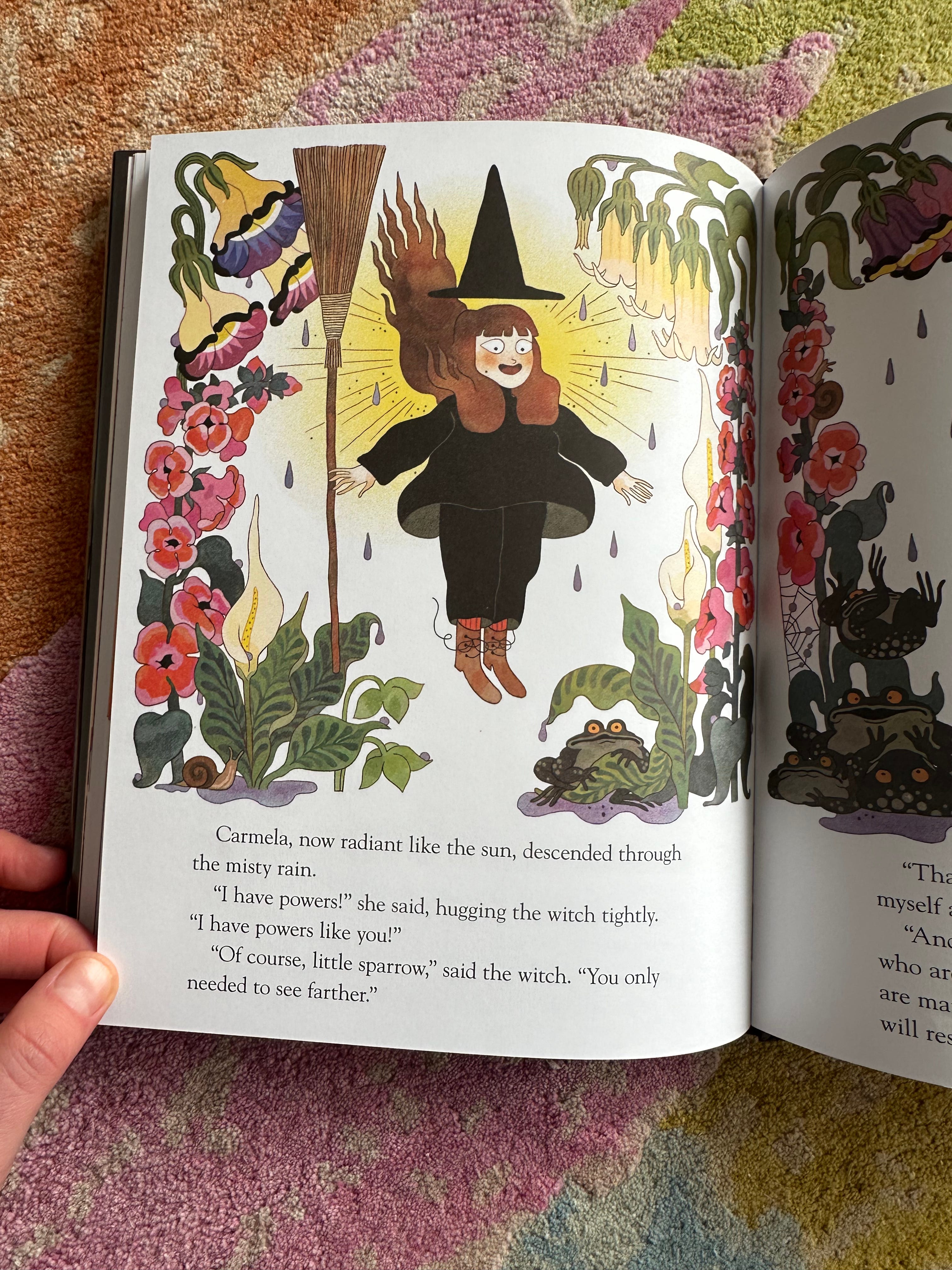 One of my favorite new children’s books is The Witch Tower by Júlia Sardà. This book is a world rich in detail, color, and heart. After borrowing it from our beloved library, I read it to my son on the sun dappled rug in our living room. Both of us pausing at spreads to pour over the details in the illustrations. The protagonist Carmela finds herself walking into an enchanting world where mermaid grease washes away envy, a giant’s hair helps her face bullies, a circular library holds secrets, and a dome of crystal prisms opens a view to the cosmos. As she unravels the knots of loneliness, hurt, and self doubt with the witch’s help, she finds strength in herself.