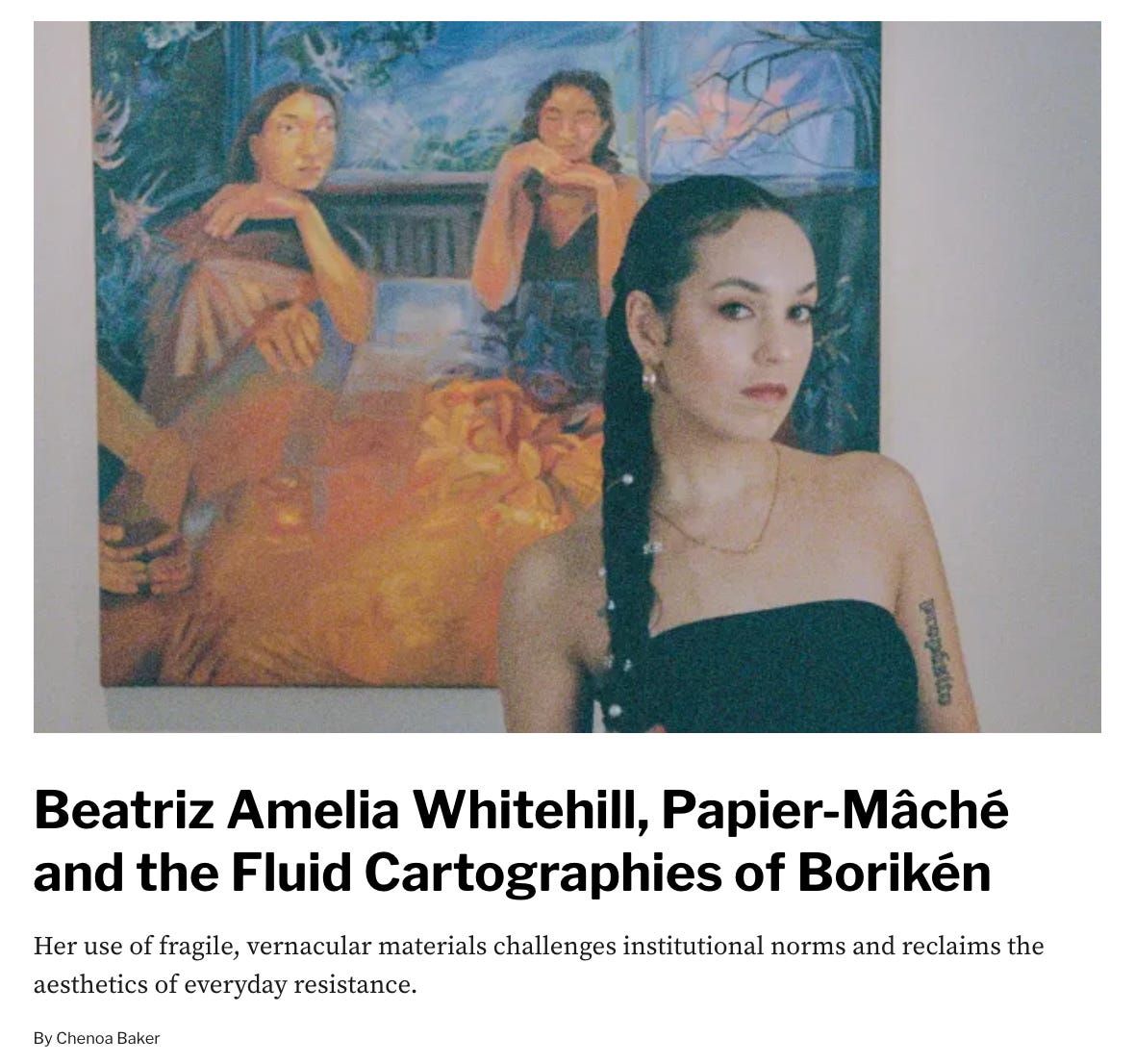 The brilliant Chenoa Baker—arts writer, curator, and adjunct—recently wrote about Puerto Rican-American multidisciplinary artist Beatriz Amelia Whitehill for Boston’s Observer. “Beatriz Amelia Whitehill, Papier-Mâché and the Fluid Cartographies of Borikén” is a thoughtful exploration of Whitehill’s work, specifically her papier-mâché vejigantes (folkloric characters in Puerto Rican festival celebrations). Baker observes Whitehill’s use of a fragile material as a tool of defiance, “[Whitehill] deconstructs and reconstructs mid-20th-century maps of Puerto Rico with sketches of vejigantes and unknown figures and painted flames on the horns, demonstrating an embodied colonial, imperial and folkloric cartographic palimpsest. These fragmentary forms suggest that maps are psychological and not fixed, which is in tension with mapping indigeneity and Blackness.” - Chenoa Baker