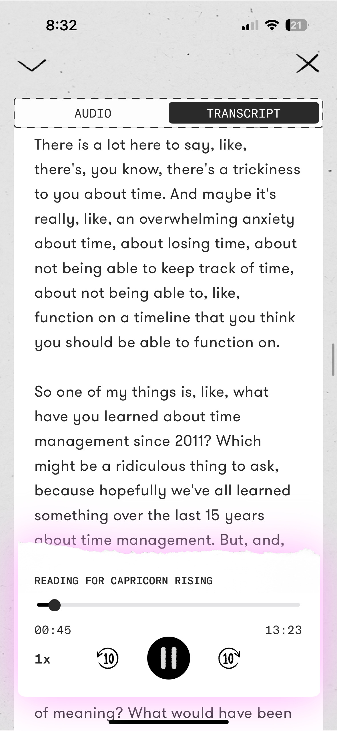The week before my recent birthday, my chart reminded me of this “trickiness” with time I have. “An overwhelming anxiety about time, about losing time,” Chani’s voice resonated in my ears as she read out the week ahead for Capricorn Rising. “About not being able to function on a timeline that you think you should be able to function on.” At this, I exhaled. The muck was gaining clarity.